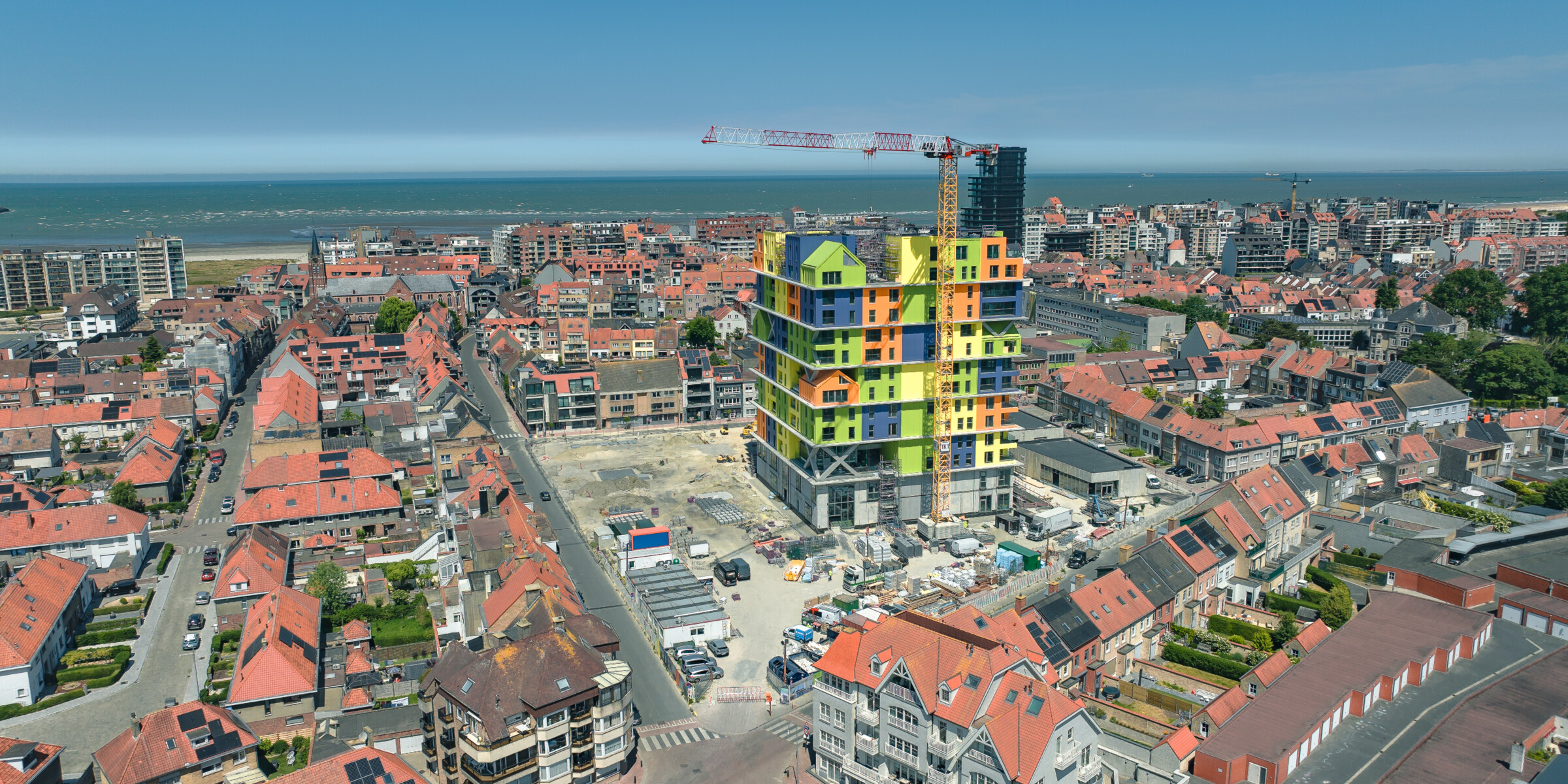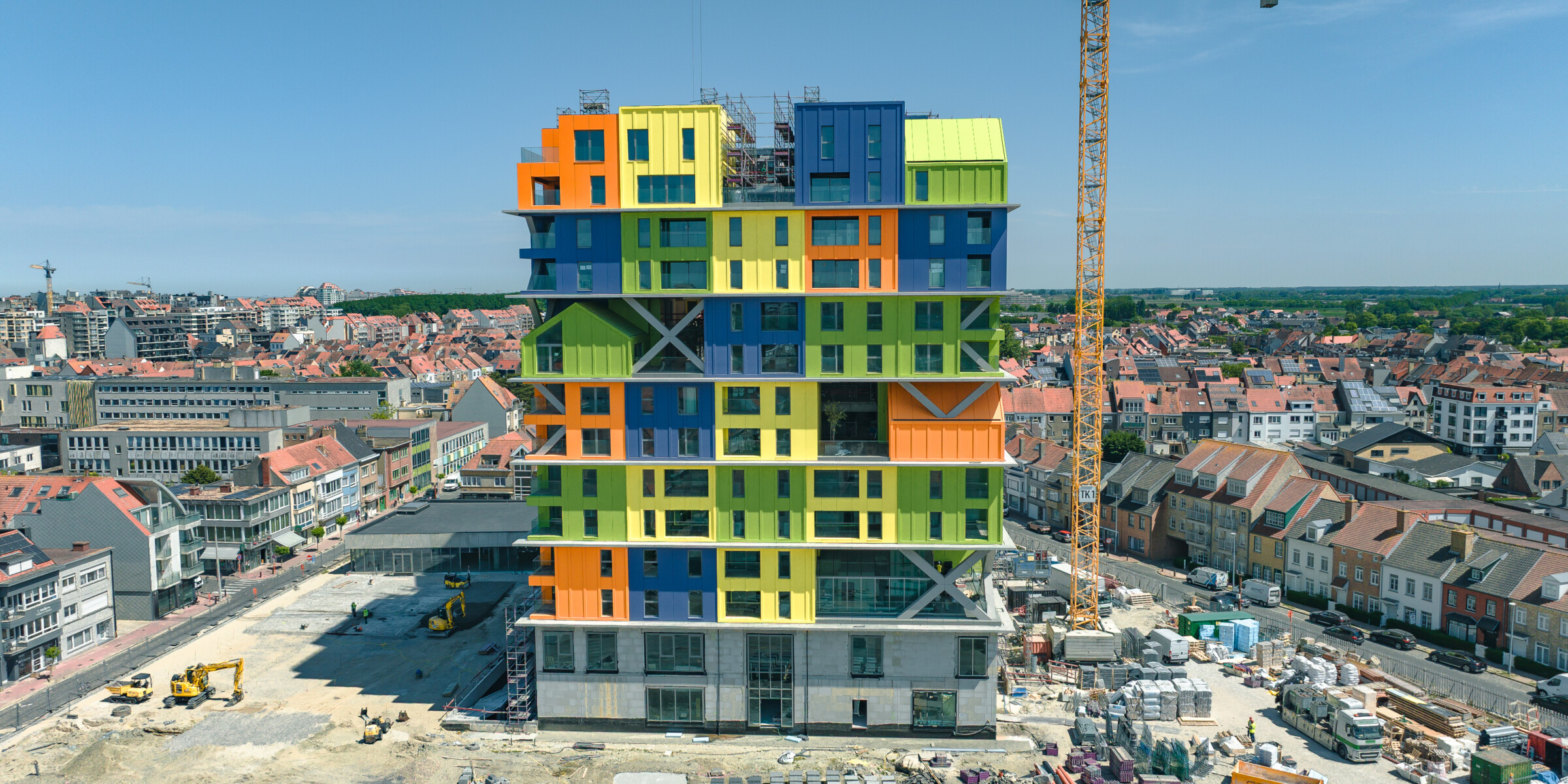 Op 300 meter van de zee komt in Knokke-Heist het unieke woonproject Hoost. Het is niet alleen ongezien in België, maar gooit nu al internationaal hoge ogen. Dat is te danken aan de spektakelarchitectuur van het Parijse architectenbureau Jakob + MacFarlane, dat voor Hoost een iconische toren met een felgekleurde gevel ontwierp. Zoiets zag je nog niet eerder. Niet alleen de buitenkant valt op, ook de binnenkant van dit ‘stad-huis’ vormt de basis van een levendige buurt.